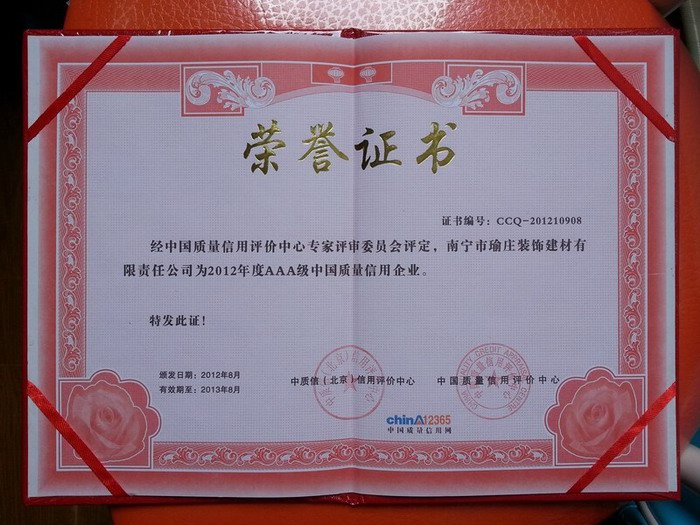 中國質(zhì)量信用AAA級(jí)企業(yè)證書
